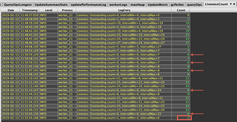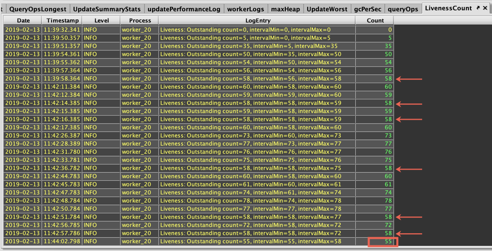 After executing the query above, select the tab in Console 2 for the LivenessCount table. Once the query initializes, the count shown rises to 58, as shown below.