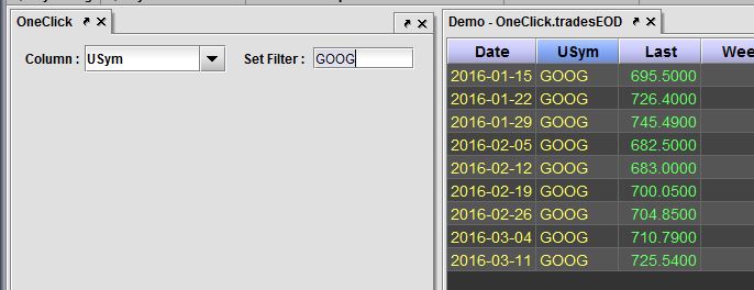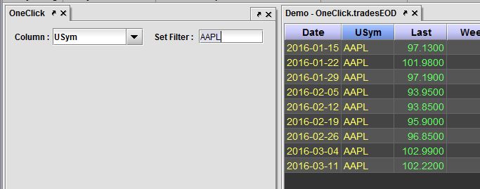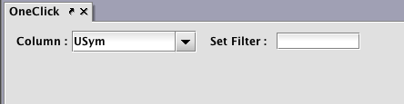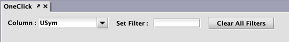 To filter the data in the table with the OneClick filter, you first need to select the name of the column to be filtered. In this case, we want to filter the data in the column named USym, so there is no need to change that value in the Column list. We can then enter the value in the Set Filter field, and press the Enter key.