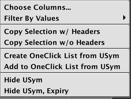 You can also create lists directly from the data in a table. To do so, place your mouse cursor in the column of the table containing the values you want to include in the list. Next, click and drag your mouse over the table so all of the values you want to include are highlighted. (Note: Entire rows will be highlighted as your drag your cursor over the table. However, the OneClick List is created using only the values in the first column in which you originally clicked.) Release the mouse after you've highlighted all of the values to be included. Then right-click in the highlighted area and select Create OneClick Listfrom <column name> in the drop-down menu. In the example below, you would select Create OneClick Listfrom USym.