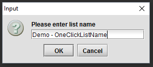 After selecting Create OneClick Listfrom USym, you will be prompted to provide a name for the list, as shown below.
