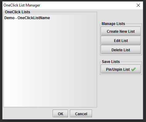 As shown below, the OneClick List Manager includes a list of all existing OneClick Lists on the left side (if there are any). On the right side of the window, there are options to Create, Edit, Delete and to Pin/Unpin List.