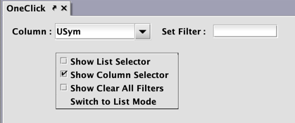 When Show Column Selector is selected, the OneClick panel enables content filtering based on the values entered in the Column field and the Set Filter field. See image below.