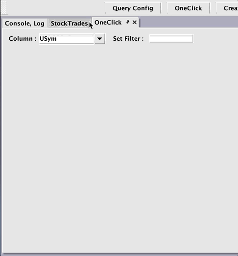 To initiate the process, click OneClick at the top of the Deephaven interface. Deephaven then generates a panel in the console with a tab labeled OneClick. See below: