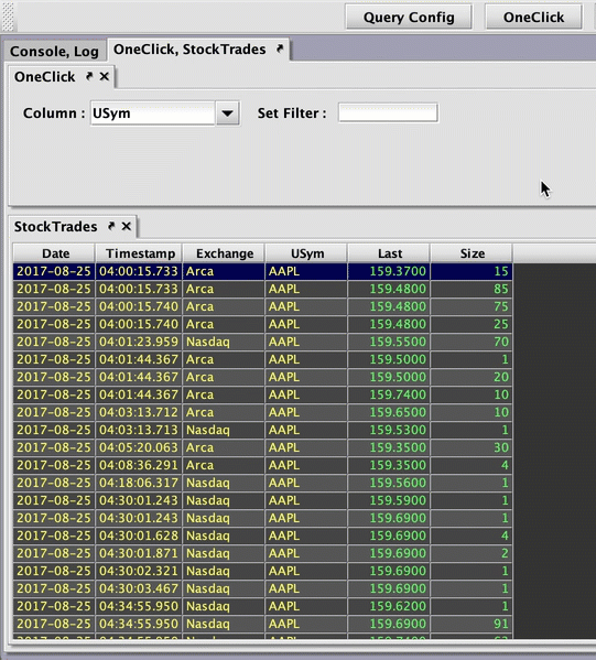 If you wanted to look at the data for only one particular USym, you could sort the table on the USym column and then scroll through the table until you found the particular USym you were seeking. Or, you could write another query to limit the content to one particular USym, but that would be time-consuming and inflexible — you'd have to write new code for each USym. Or, you can use the OneClick filter.