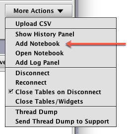 - Add Notebook opens a Notebook panel in the console, which can be used to develop query components, stage draft queries, or simply store notes. See: The Notebook for more information.