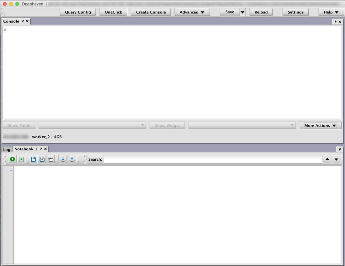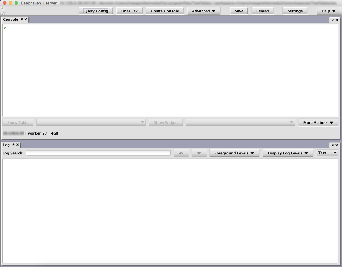 To access the console, open Deephaven and then click Create Console. You will then be given the opportunity to rename the new console panel. After clicking OK, a new panel will open with a Console window at the top and the Log window at the bottom, as shown below.