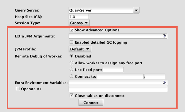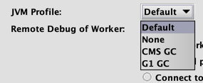 JVM Profile - This drop-down field allows users to select an alternative profile for new persistent queries. Remote processing profiles are used to specify JVM parameters and environment variables for persistent queries and interactive consoles. Several predefined profiles are available, such as CMS GC or G1 GC, and new ones can be defined using controller properties.