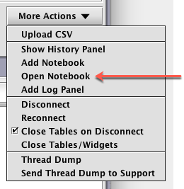 To open an existing notebook, click More Actions and select Open Notebook. A dialog window will then enable you to navigate to the location of an existing notebook on your workspace. Once selected, the notebook will be opened in a new tab.