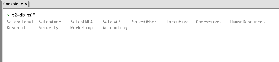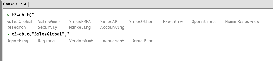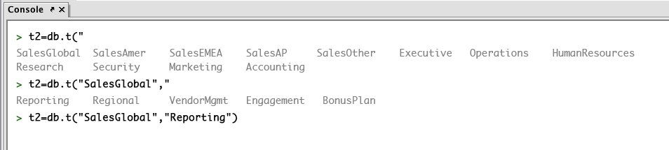 For example, if you type t2=db.t(" and then press the Tab key, the console will first provide a list of installed namespaces. In the first example below, there are 12 namespaces listed.