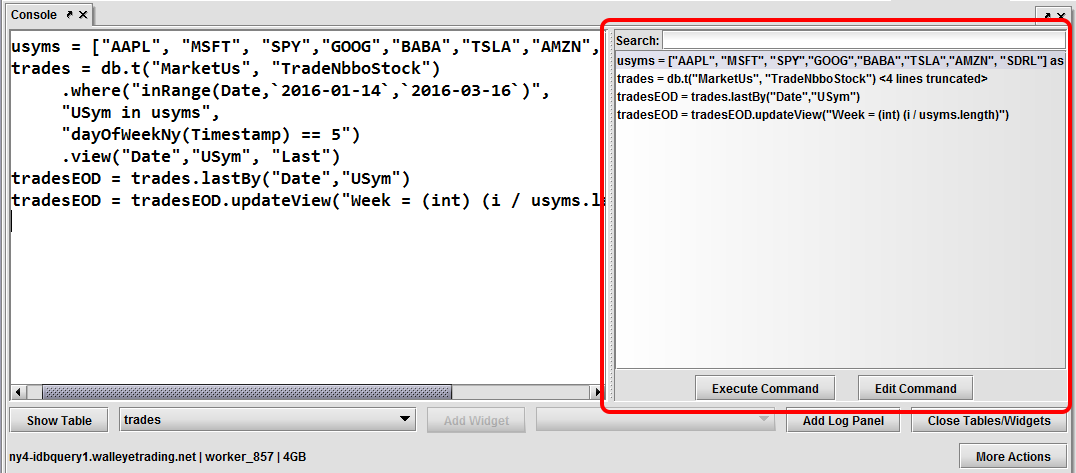 The Deephaven History panel is used to review, retrieve and rerun queries that were used in previous queries. The History panel can be accessed two ways: