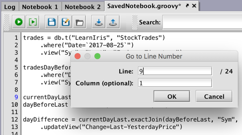 Go to Line… - This option opens the Go to Line Number dialog window, which allows you to go to a line or a column (optional) in the Notebook to easily jump to any location. The dialog can also be accessed using the keyboard shortcut Ctrl+G /⌘+G (macOS).