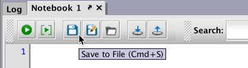Save - This option saves all of the content of the Notebook to a file on the user's system. When Save is clicked for the first time, the Save dialog window prompts the user to enter a filename and select the file location. Depending upon the content in the Notebook, the file is saved as .txt, Groovy or Python filetype. Clicking Save again overwrites the existing file with the current Notebook content. After the file is saved, the name shown on the Notebook tab changes to match the filename used during the Save process. Note: Notebooks with unsaved changes include an asterisk (*) in the panel tab.