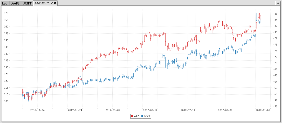 When the code above is processed, the following OHLC chart is produced, which represents the opening, high, low and closing price of AAPL and MSFT over a year: