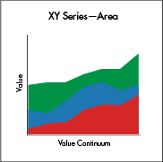 An XY Series Chart is generally used to show values over a continuum, such as time. XY Series can be represented as a line, a bar, an area or as a collection of points. The X axis is used to show the domain, while the Y axis shows the related values at specific points in the range.