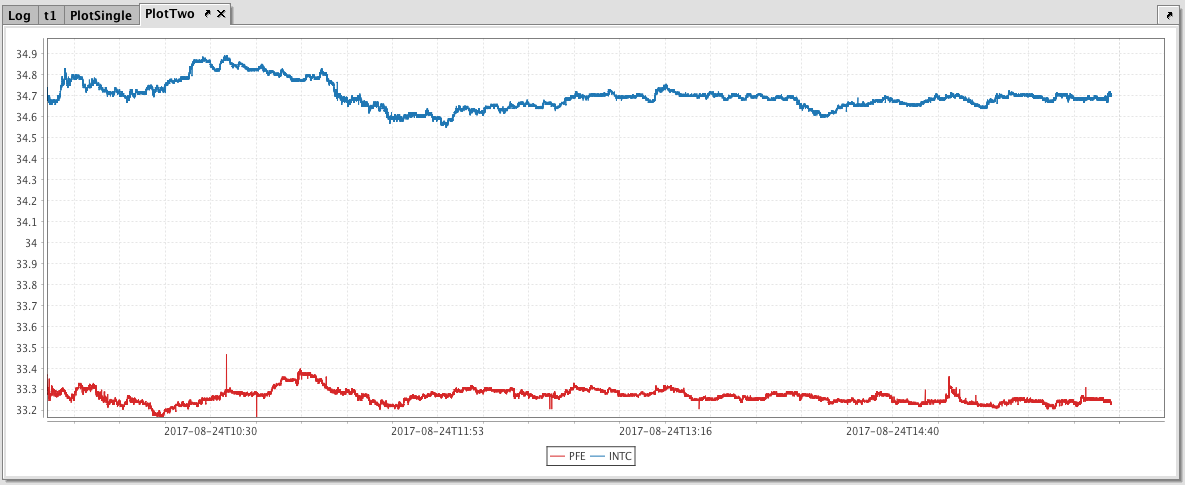 PlotTwo = plot("PFE", t1.where("USym = `PFE`"), "Timestamp", "Last")