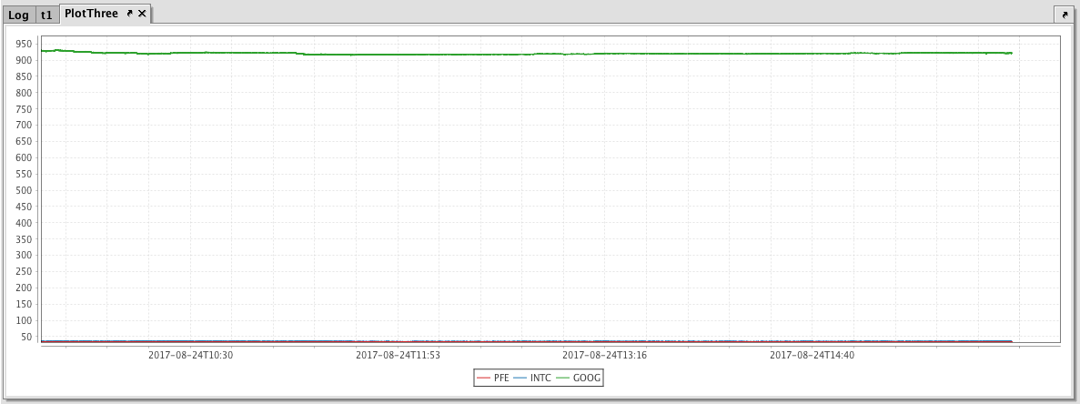 When the code shown above is processed, values for PFE and INTC are shown on the left Y axis, while the values for GOOG are shown on the right.