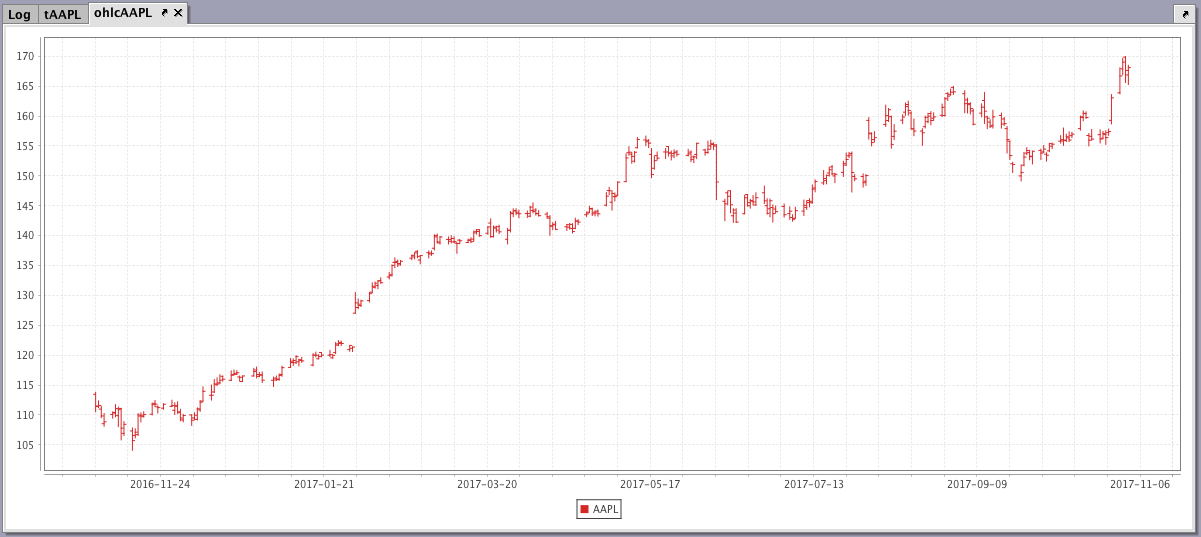 When the code above is processed, the following OHLC chart is produced, which represents the opening, high, low and closing price of AAPL over a year: