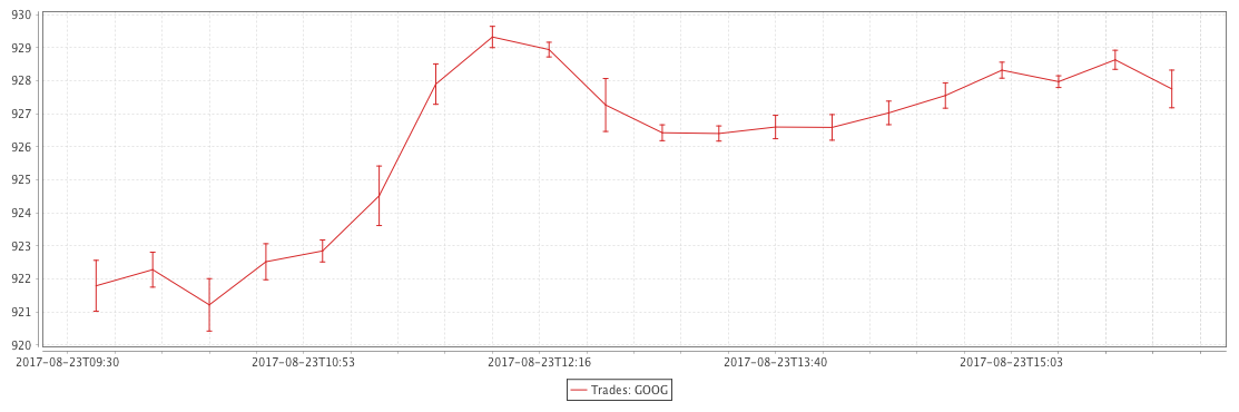 tradesXYPlot = errorBarY("Trades: GOOG", tradesStats.update("AvgPriceLow = AvgPrice - StdPrice", "AvgPriceHigh = AvgPrice + StdPrice"), "TimeBin", "AvgPrice", "AvgPriceLow", "AvgPriceHigh").show()