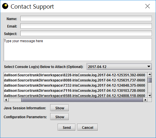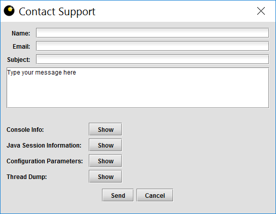 The Console Info, Java Session Information, Configuration Parameters and the Thread Dump will automatically be attached to the email when sent. You can review the information contained in each by clicking the respective Show button.
