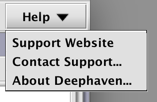 The Help button is located in the top right corner of the Deephaven console. When clicked, a drop-down menu provides options for Support Website, Contact Support, and About Deephaven.