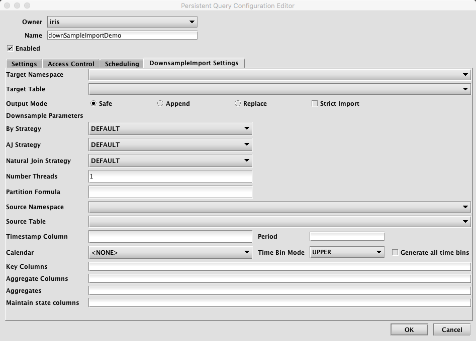 When DownsampleImport is selected, the Persistent Query Configuration Editor window shows the following options:
