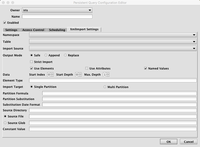 When XmlImport is selected, the Persistent Query Configuration Editor window shows the following options: