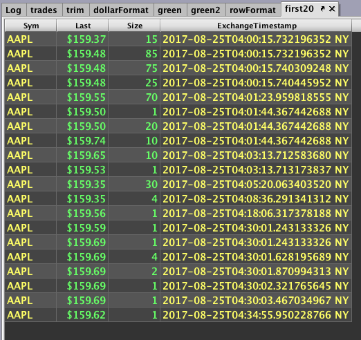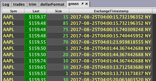 green = dollarFormat.formatColumns("Last=`GREEN`")