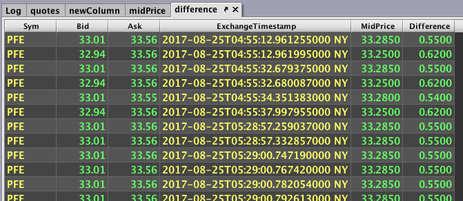 difference = midPrice.updateView("Difference=abs(Bid-Ask)")