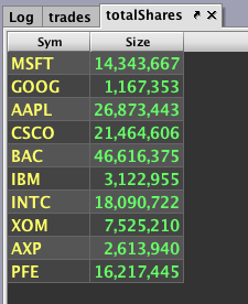 totalShares = trades.view("Sym", "Size").sumBy("Sym")