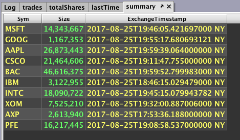 summary = trades.by(caf.AggCombo(caf.AggSum("Size"), caf.AggLast("ExchangeTimestamp")), "Sym")