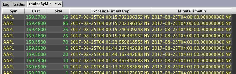 tradesByMin = trades.updateView("MinuteTimeBin=lowerBin(ExchangeTimestamp, MINUTE)")