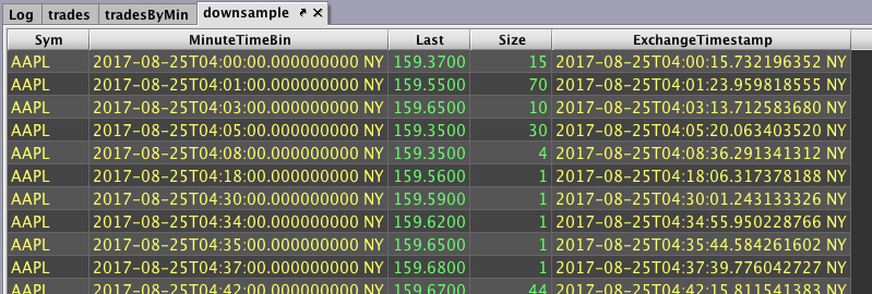 Note: This recipes downsamples trades to the first trade of each minute by using lowerBin and firstBy(). However, one could downsample to the last trade each minute by using upperBin and lastBy().