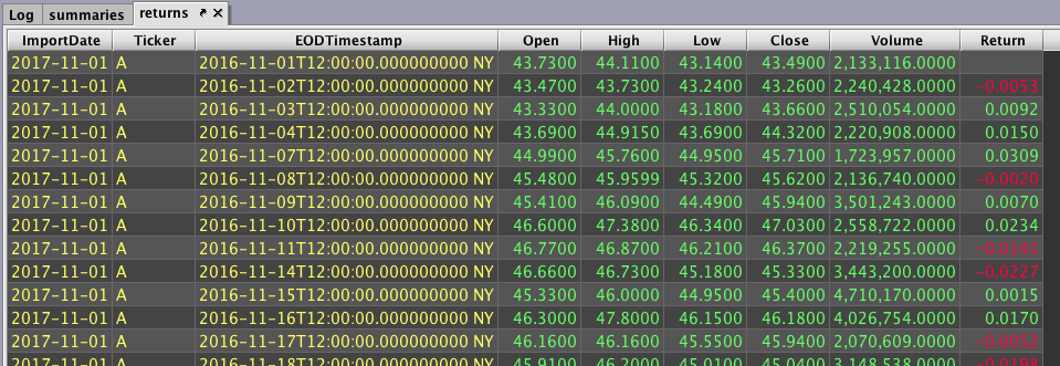 returns = summaries.updateView("Return=(Ticker=Ticker_[i-1]) ? log(Close/Close_[i-1]) : NULL_DOUBLE")