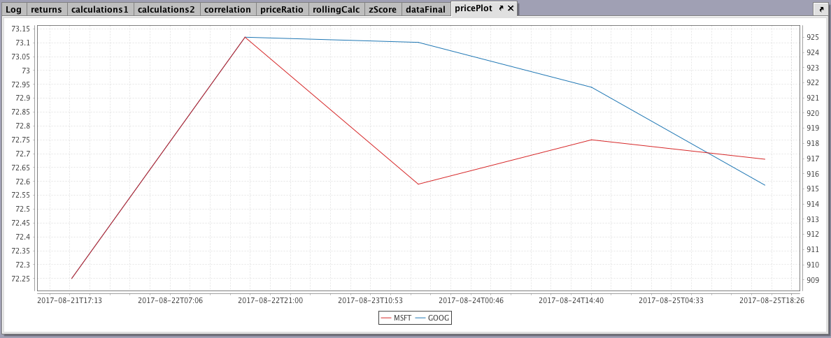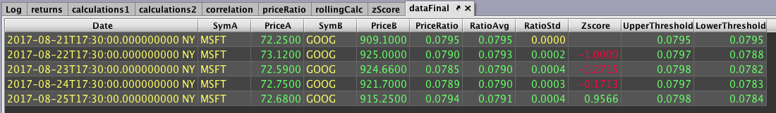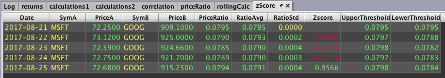 zScore = rollingCalc.updateView("Zscore=(PriceRatio-RatioAvg)/RatioStd", "UpperThreshold=RatioAvg+2*RatioStd", "LowerThreshold=RatioAvg-2*RatioStd")