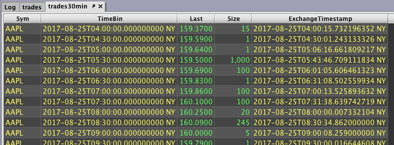 trades30min = trades.updateView("TimeBin=lowerBin(ExchangeTimestamp, 30*MINUTE)")\