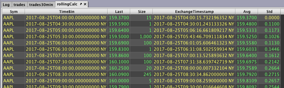 .update("Avg=(double[])rollingAvg.call(30, Last)", "Std=(double[])rollingStd.call(30, Last)")