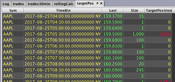 targetPos = rollingCalc.updateView("Zscore=(Std > 0) ? (Avg-Last)/Std : NULL_DOUBLE", "AdjZscore=signum(Zscore) * min(maxPos, max(abs(Zscore)-minEdge), 0.0)", "TargetPosition=(int)(liquidity*AdjZscore/Last)")
