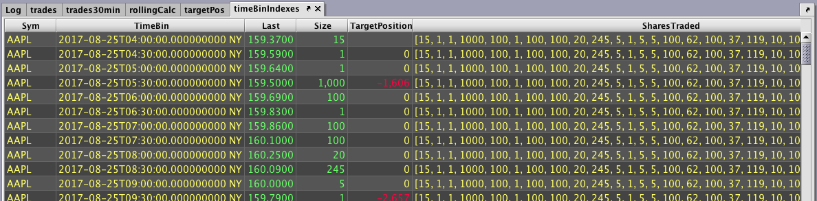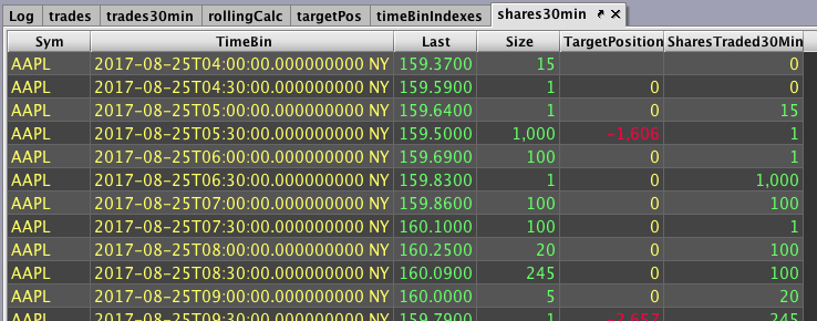 timeBinIndexes = targetPos.leftJoin(trades30min, "Sym", "Times=ExchangeTimestamp, SharesTraded=Size")