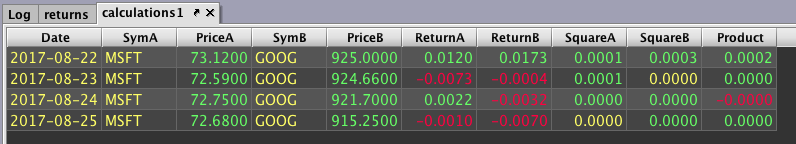 correlation = calculations2.view("Correlation=(N * (Product - (ReturnA * ReturnB))) / sqrt((N * SquareA - pow(ReturnA, 2)) * (N * SquareB - pow(ReturnB, 2)))")\