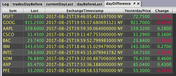 dayDifference = currentDayLast.exactJoin(dayBeforeLast, "Sym", "YesterdayPrice=Last")\