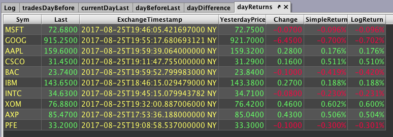 dayReturns = dayDifference.updateView("SimpleReturn=Change/YesterdayPrice", "LogReturn=log(Last/YesterdayPrice)")\