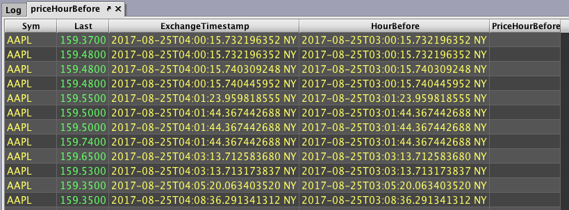 priceHourBefore = tradesHourBefore.aj(tradesHourBefore, "Sym, HourBefore=ExchangeTimestamp", "PriceHourBefore=Last")