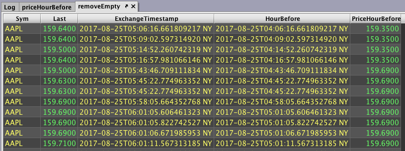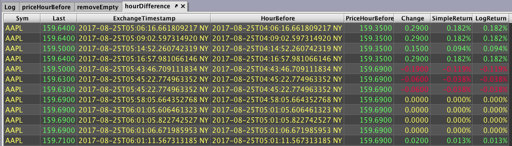 hourDifference = removeEmpty.updateView("Change=Last-PriceHourBefore", "SimpleReturn=Change/PriceHourBefore", "LogReturn=log(Last/PriceHourBefore)")\