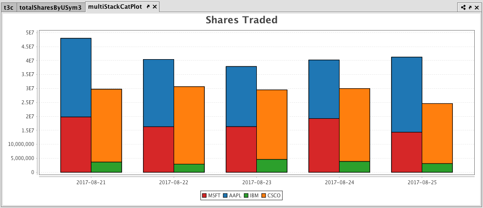 multiStackCatPlot = catPlot("MSFT", totalSharesByUSym3.where("USym = `MSFT`"), "Date", "SharesTraded")
