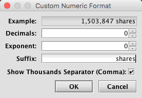In the example above, the column will display each value with commas and the custom suffix "shares".