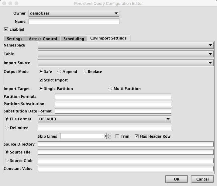 - Single/Multi Partition: This controls the import mode. In single-partition, all of the data is imported into a single Intraday partition. In multi-partition mode, you must specify a column in the source data that will control to which partition each row is imported.