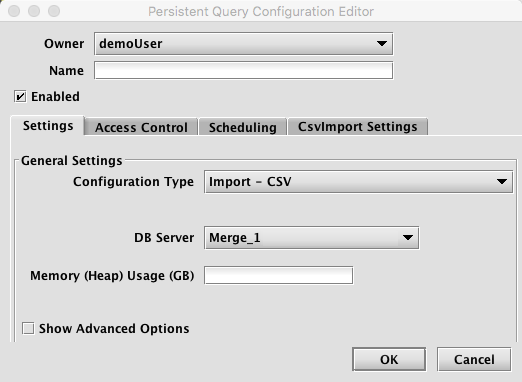 Options available in the Show Advanced Options section of the panel are typically not used when importing or merging data. To learn more about this section, please refer to the Persistent Query Configuration Viewer/Editor.