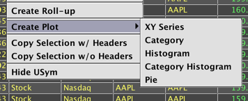 Users can create plots directly in the user interface using the Create Plot option in the right-click table data menu. Plots created using this option will not appear in the Show Widget menu. However, these plots can be saved as part of your workspace and will reappear when you open a saved workspace.