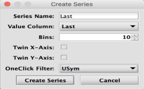 In this example, we will name the series "Last", then select Last as the Value Column. Then, we can enter 10 in the Bins field to include 10 intervals in the histogram. We'll also click in the OneClick Filter drop-down menu and select USym. Then click Create Series.