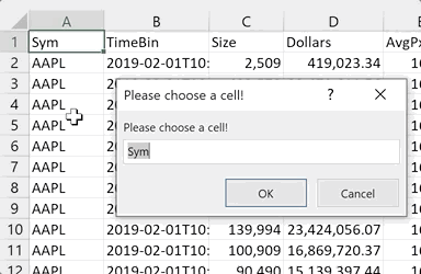 - Place at selected cell - If this option is selected when you click the Get Data button on the panel, the Deephaven Excel Add-In will place the returned data at the currently-selected cell in the current worksheet. If multiple cells are selected, the upper-left cell will be the upper-left cell of the returned data.
